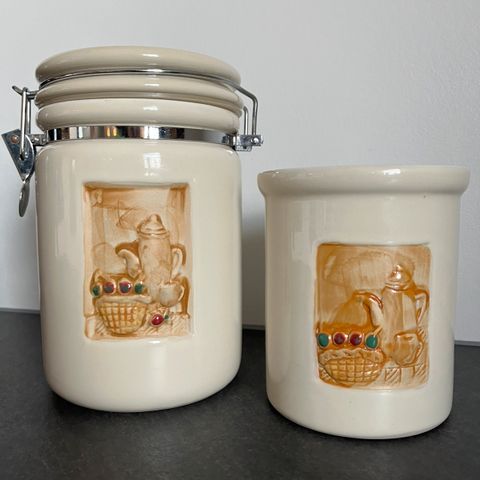 Porcelæn, 4 krukker, patentlåg til småkager , mel, slik, Fra 80erne, med blyfri glasur, Ældre krukker der blev købt som nye i firserne,. Var temmelig dyre, sikkert fordi de blev fremstillet med blyfri glasur Gummiringene kan trænge til udskiftning. Der er lidt glasurafslag på låg. Har været brugt til småkager, sukker, flormelis , mel osv. Samlet pris for alle fire 375,- fast pris