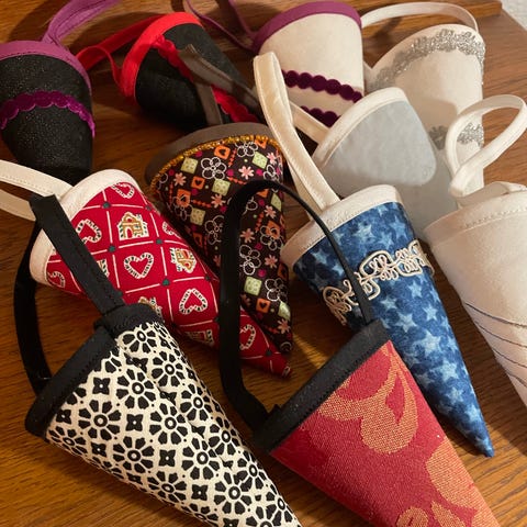 5 store meget flotte hjemmesyede kræmmerhuse i stof. Skal måske lige stryges lidt, ellers lige til at hænge op. De måler 20-28 cm i højden uden hank.