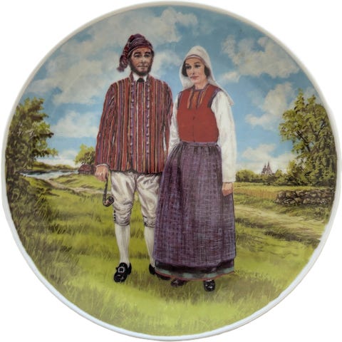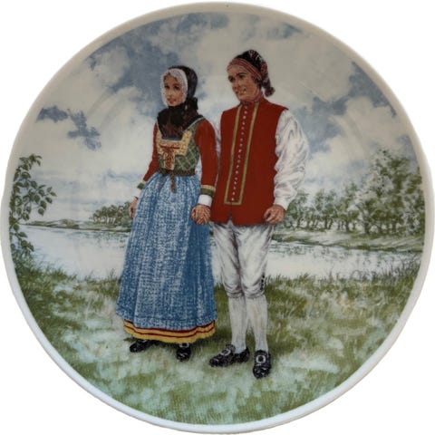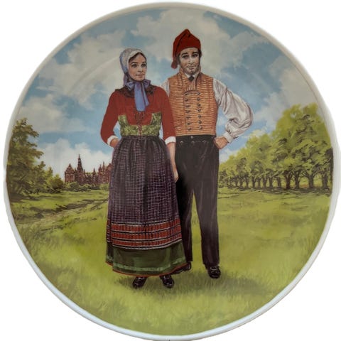 Flot gråblå platte af ukendt oprindelse, som viser to personer i folekdragter - og har teksten "Odense Amt".