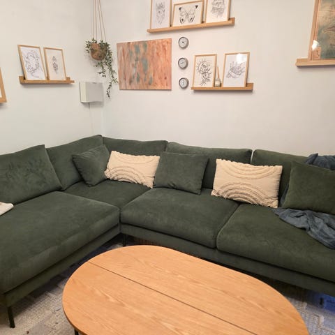 Chaiselong, fløjl, Har 2 af de samme sofa, sælger begge. Prisen er pr. Sofa har også 1 stol + skammel, som vist på billedet det koster 1000kr for det sæt og sofaen 2200kr pr sofa. Let, elegant og moderne designet sofa med chaiselong. Sofaen er vendbar og derfor beslutter man sig bare om hvilken side man vil have chaiselongen i når man samler sofaen. Sofaen er konstrueret med træramme hvor i der er nozagfjedre. Sædehynden er med fast og formstabilt polyether skum, hvilket giver en fantastisk siddekomfort. Sofaen er monteret med meget slidstærkt og moderne fløjl. En sofa hvor man virkelig får meget for pengene. Fås også i grøn fløjl. Der kan tilkøbes en lænestol med fodskammel i samme stof. • Let, elegant og moderne design • Rigtig dejlig siddekomfort • Slidstærkt og kraftigt fløjl • Træramme med nozagfjedre • Sædehynde med fast og formstabilt polyether skum • Mål i cm. L.217 x D.149 x H.87