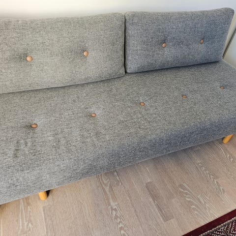 Sofaen er sammensat af en boxseng nederst og madras ovenpå. Perfekt løsning til lille lejlighed, hvor du både har brug for en sofa og en god seng i en.