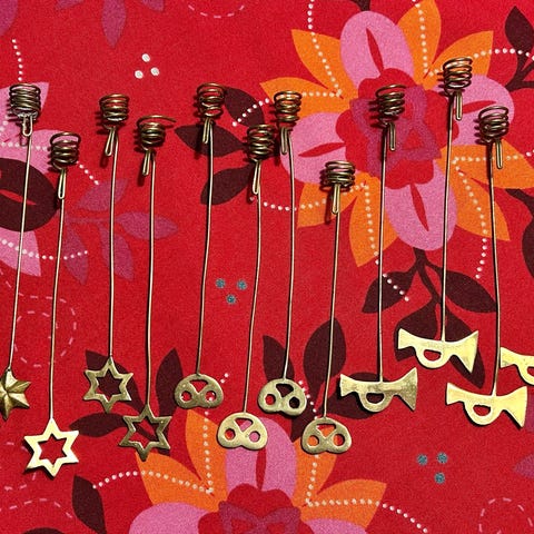 5 lysholdere i mærket Kosmos Design. Dansk design. De er lavet af messing og er 20 cm lange. 4 juletræslys medfølger