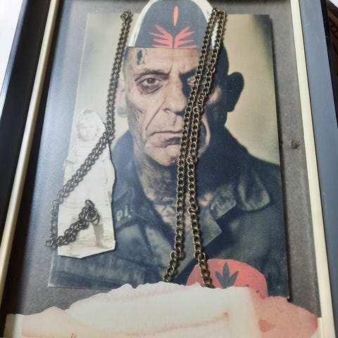 Plakat i offset tryk, efterfølgende bemalet og med collageelementer påsat.