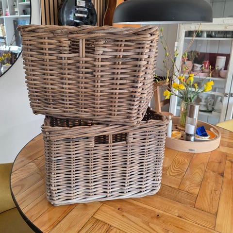 Opbevaringskurve i brun kubu i materialet rattan med læderhåndtag. Sæt af 3 stk.