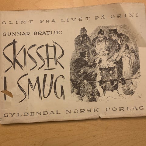 "I 1943 tegnet Gunnar Bratlie den kjente forsiden på Norsk Ukeblad som førte til at bladet ble stoppet av myndighetene, og både redaktør Ernst Gervin og Bratlie ble satt i tysk fangenskap på Grini. Boka består av tegninger og korte tekster som skildrer dagliglivet i fangeleiren under andre verdenskrig".