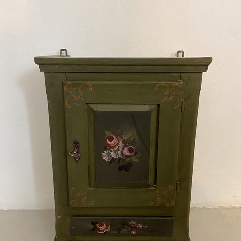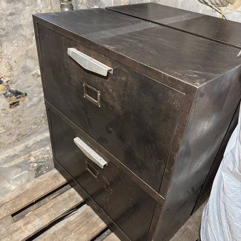 Fransk antikt metalskab, b: 97 d: 36 h: 202, Spændende og pænt gammelt metalskab. Skulle efter sigende have været anvendt som kontorskab i en fransk pengeskabs fabrik.