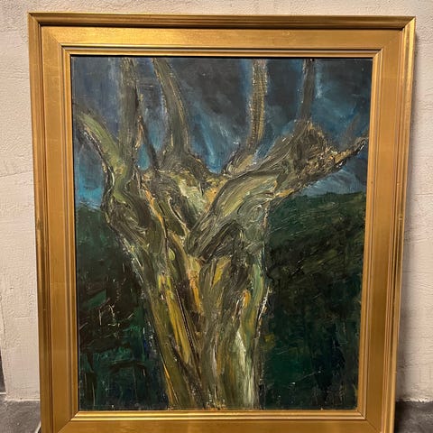 Oliemaleri, Tove Schultz, signeret TS., b: 76 h: 49, Abstrakt motiv, Sol over oprørt vand. Olie på lærred, i god stand. Rammemål 84x56. Et afslag nederst på ramme. Gerne besked med sms, evt. forsendelse + porto.