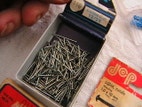 Søm/Skruer. Blandet lot., Blandet Lot: 1 pose med runde Messing søm. 1,o X1,o cm. Uåbnet. 15,- kr. + 1 æske med elforsinkede søm. Dia. 12 X 25. 10,-kr. + 1 pose med 8 "kroge" med gevind. 3 cm. . 10,-kr + 7 "kroge" med gevind:3cm. 10,-kr. + 17 stk L.2 cm. 10,- kr. + 1 æske tegnestifter. "Guld" 5,- kr. + 1 æske med 44 stk Klips. L. 2,5cm. 5- kr. + 27 øskner og 26 stk "åbne" øskner L. 14mm. + hoved. 15kr. + 1 æske el forsinkede øskner 15 stk, 5 X12mm 5kr. + 1 æske med 5 blå ravpluks 2,- kr. Hele dette lot: 40,- kr. + porto. Sender gerne.