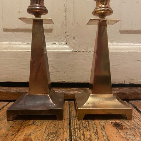 2 flotte messing lysestager, der blot trænger til en pudsning.