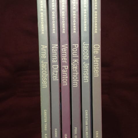 5 bøger fra serien Danske Designere omfattende Arne Jacobsen , Børge Mogensen , Nanna Ditzel , Kaare Klint og Verner Panton