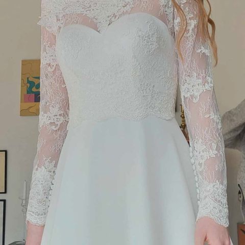 Brudekjole, Bianco Evento, str. 38, Næsten som ny, Flot brudekjole, Bianco Evento, str. 38, brugt 1 gang. Kjolen med underskørt har et svagt Rosa Look med glimmer. Min højde/vægt er 1,74m/68kg og brugt med ca. 5cm høje hæle. Nypris kr. 14.000 - et stærkt tilbud.