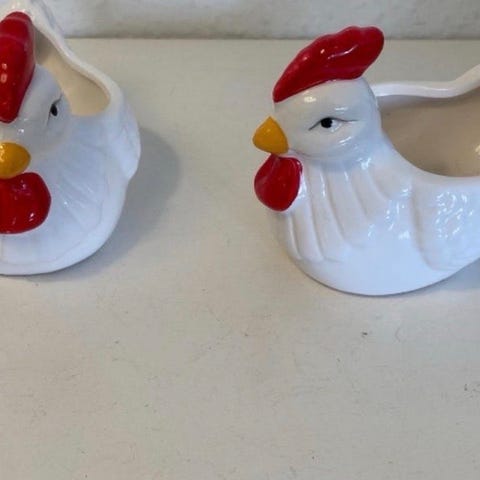 2 stolte hvide høns påskepynt keramik, 2 stolte hvide høns cirka 10 × 10 cm, hule som man kan fylde dem op med påskeæg eller en lille blomst eller eventuelt groft salt