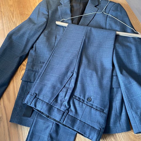 Jakkesæt, Lindberg, str. M, Grå , Næsten som ny, Jakkesæt / konfirmationstøj af mærket Lindberg str 50 (passede min dreng i 8. Klasse). Slim fit. Grå med blå tern. Brugt en gang + ny renset