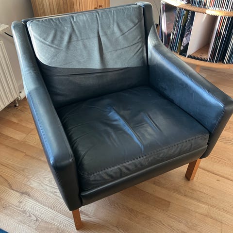 Anden arkitekt, Erik Wørts, Lænestol, Erik Wørts lænestol bestukket med cognac farvet læder. Ben af eg. Fremstillet af FDB - model E-L603. H: 77, B: 68, D: 52. Fremstår som ny. Nypris 15.000 kr.