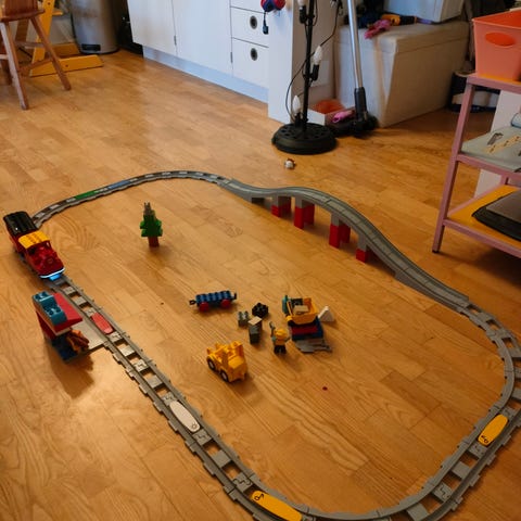Lego Duplo, Duplo tog, Velholdt Duplo tog fra 80erne, fra ikke rygerhjem eller husdyr, 12 lige skinner, 16 buede, 4 skiftespor, 1 bro, 2 kryds, 15 små skinner ca. 1/3 af en lige skinne. Sælges samlet for 350,-kr. Kan sendes på købers regning.