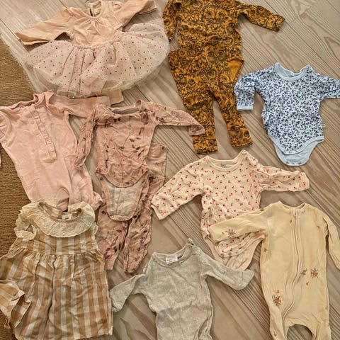 Forskellig pigetøj m.m, , str. 68, /74. Flyverdragten uden hætte, i "Polyester, Pels " mrk. Friends. Med prismærke, blød og lækker. Anvendelig både i barnevogn og bil. Hvid sut til 0.3 mdr. 25.- Bog med mange fotos. 35.- Sokker og sko. 10.-/20.-. Suttesnor 15.-. . 2-delt kjole-buks-sæt str. 60, 60.-.Trøje + buks i strikket acryl 75.- Sokker 15.- Sko 35.- vanter 10.- Alt er ubrugt nyt.)
