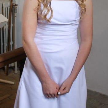 Konfirmationskjole, Lissa, str. S, Fin stropløs kjole med sjal og korset på ryggen. Brugt en enkelt gang på konfirmationsdagen. En enkelt dråbe på bagsiden, og den skal derfor nok til rens.
