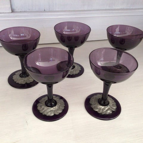 Glas, Glas/tin, Snapseglas eller lign. Gamle Franske rødt glas indbundet i tin dekoration med alm glasklar fod