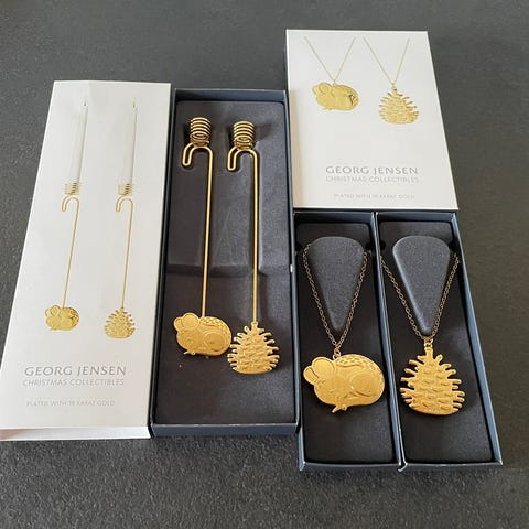 KØBES/ SØGES: Georg Jensen forgyldte ornamenter og lysholdere: kogle og mus fra 2023.