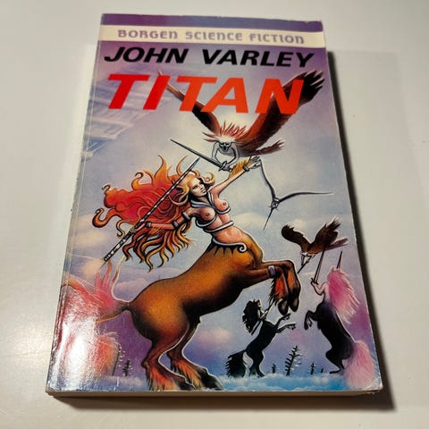 Titan, John Varley, genre: fantasy, Borgen science-fiction udgave af John Varleys Titan fra 1986. Har stået på en reol i mange år og derfor er ryggen bleget. Bogen har været læst flere gange.