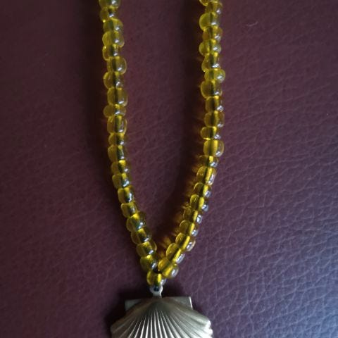 Muslingeskal udskåret til en fjer og gennemsigtige krystaller samt sølvperle på rustfri stål kæde.
