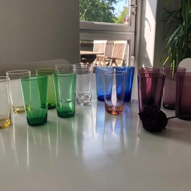 Forskellig farvede sodavandsglas i forskellige højder og former.