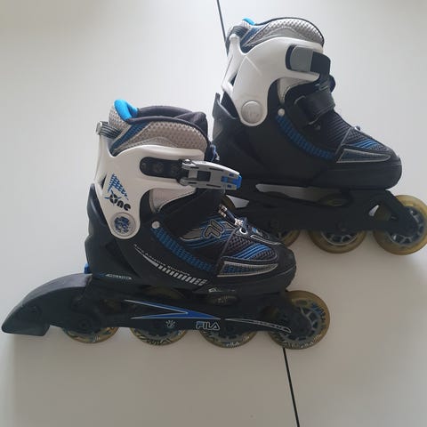 Inliners, FILA, str. 35-38, X-One, justerbar størrelse, brugt men fin stand, knæ-, albue- og håndledsbeskyttere medfølger.