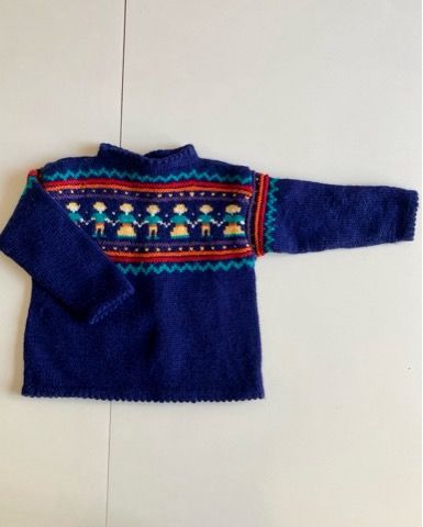 Denne sweater i et uld produkt er strikket af min mor i ca 1975. Jeg har brugt den som ca 5 årig men obs er I tvivl her. Se mål se mål. I skrivende stund har jeg også en sweater som denne til en voksen kvinde/ mand ( small) samt lillesøster/ lillebror. Skriv evt pb 22342228 så kan jeg sende dig billeder af dem i pb. Obs dette er i skrivende stund januar 2024. Hvis du synes det kunne være sjovt at klæde dig ens med dit barn.