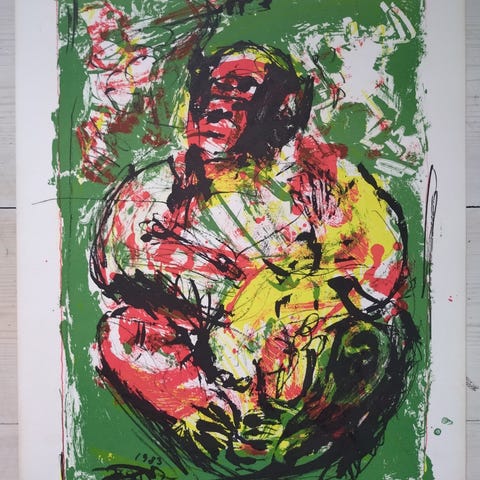 ”Familieportræt” er et originalt farvelitografi og sjældent set for det er trykt så tidligt som i 1978. Nr. 58/78. Lys mål 38 x 56 cm. Rammemål 44 x 62 cm. Og med en træramme.