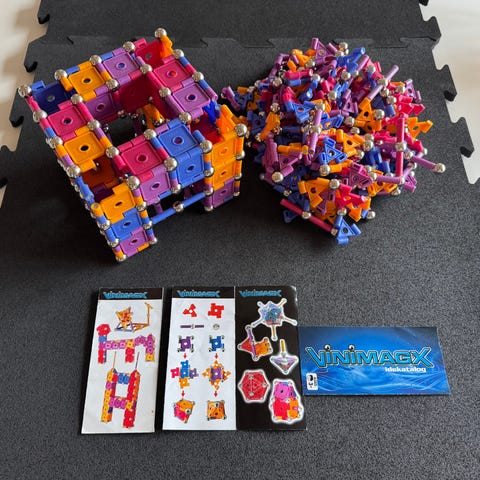 Magnetisk legetøj, Byggesæt, byg forskellige ting, VinimagX og lidt Geomag, Samlebrikker: 10 gule romber, 1 rød sekskant, 9 blå firkanter, 12-13 blå trekanter