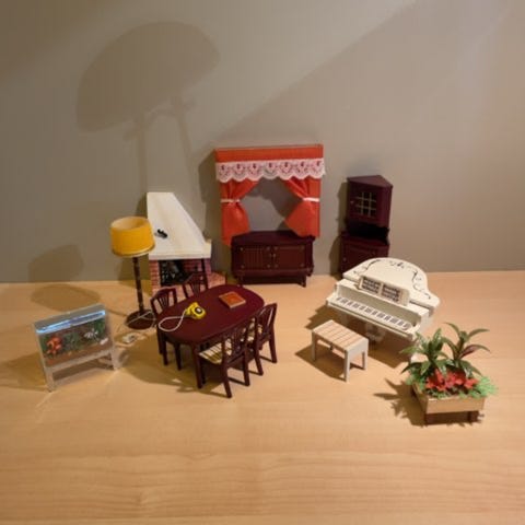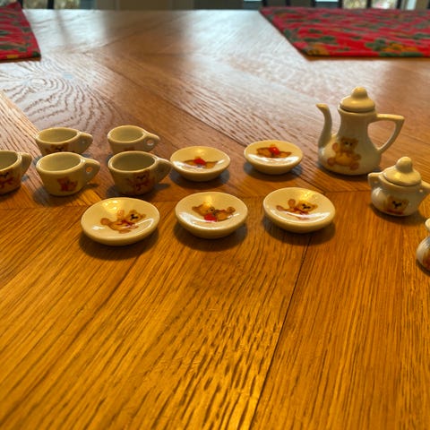 Messing-sæt til dukkehus - dukkekøkken, Gammel fint messingsæt til dukkehus. Kanden er 5 cm høj, bakken er 8cm lang.