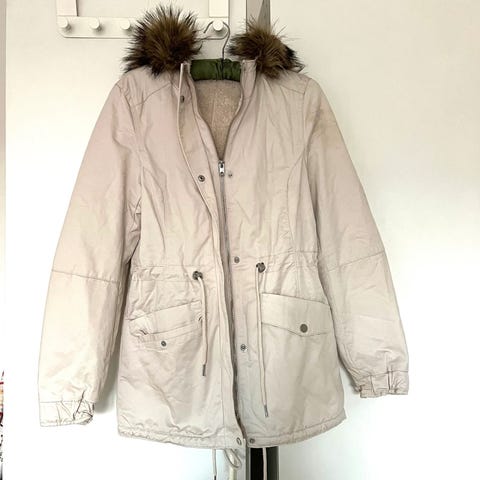 Divided skøn grå jakke str 34. Med hætte lynlås og trykknapper