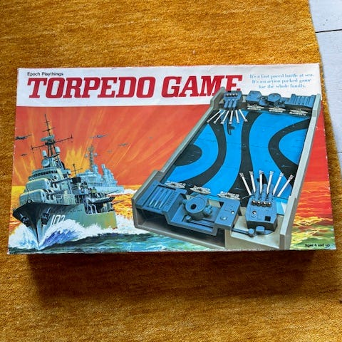 Torpedo Game, Familiespil, brætspil, TORPEDO GAME fra Epoch Playthings på engelsk. Lidt slidt æske. Alle 6 skibe er tilstede og 13 kugler. Se fotos.
