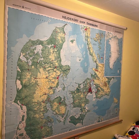 Originalt skolekort over Danmark, Ukendt, motiv: Danmark, b: 2m h: 1,58, Originalt skolekort over Danmark og istid 2 meter x 1,58 meter. Har ikke længere plads. Sælges for kun 400kroner. Ingen forhandling,da pris er sat rimelig og skarp