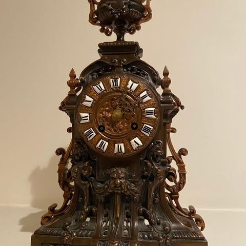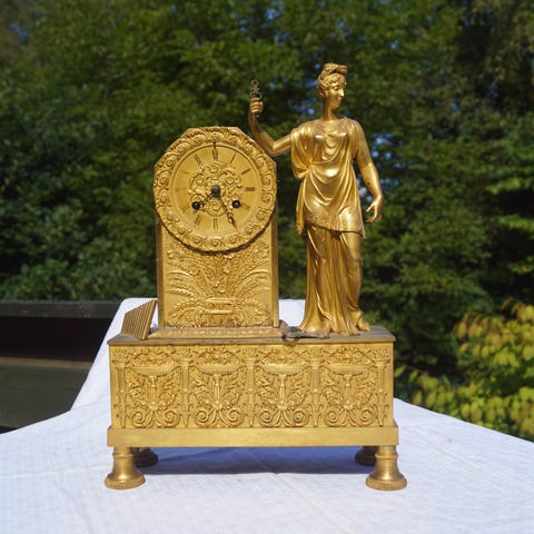 Konsolur, Japy Frères, Frankrig, af forgyldt bronze med siddende kvinde med musikinstrument og udsmykket med blomster. Urskive og plaket af porcelæn og håndmalet med blomster. Stemplet 353 S på bagside. Ca. 1830