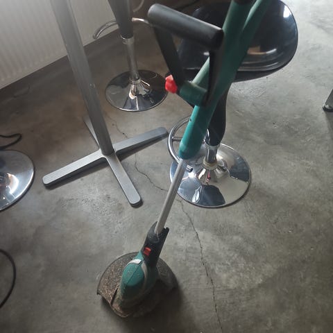 Batteridrevet busksaks. 2-i-1, hæksaks og græstrimmer. Til trimning af små buske og græskanter. Arbejdstid 30-40 minutter.