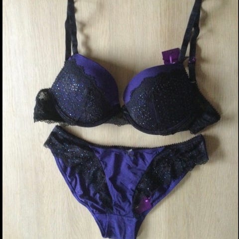 Mey Silouette bh med trusse eller string i ‘Ink blue’ (mørkeblå med lyselilla broderi).