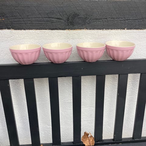 3 stk rosa jumbokopper/skåle, den ene har hårstreg indvendig, men er slet ikke utæt. (Den har ikke helt samme rosafarve som de andre 2 - se fotos) dia 12,3 cm h 7,5 cm.