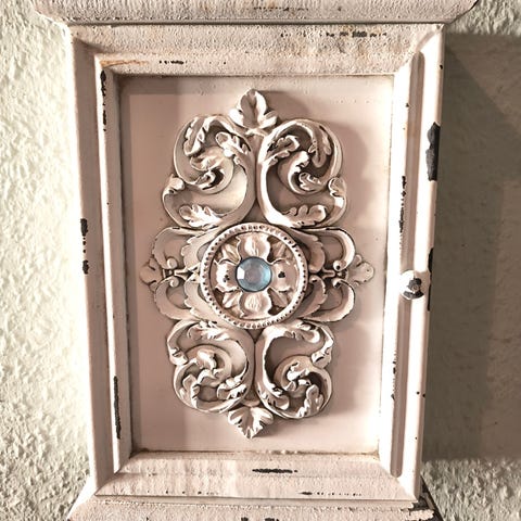 Virkeligt sødt lille nøgleskab med en fin antik udstråling Sødt lille nøgleskab med rustik udstråling i fin fransk landstil og vintagestil. Med sit antikke udtryk passer dette lille skab helt perfekt til entréen i den romantiske bolig. Her har du et super charmerende nøgleskab med en fin glaslåge og et lækkert gammeldags look. Et fint lille skab som let kan bibringe hjemmet en atmosfære af nostalgi og fransk landstil, ligegyldigt hvor du hænger det. Rustikt lille nøgleskab med låge i sød fransk landstil Size: 25x17x7 cm