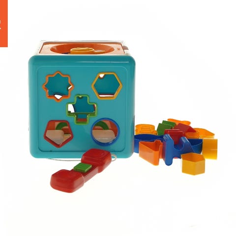 Ældre aktivitetslegetøj aktivitet legetøj stor plastik puttekasse med gul hank og med Farvede klodser