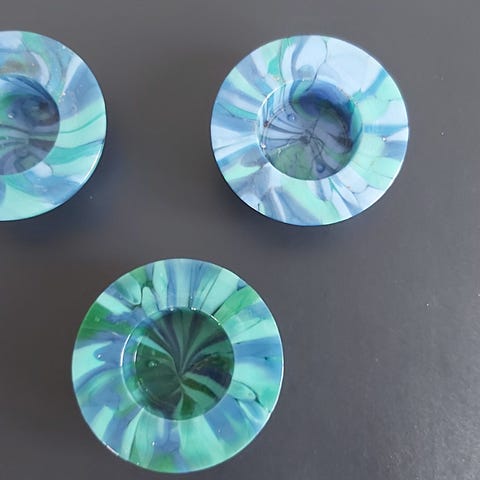 2 stk. multi blå massiv glas, dia 7,5 cm h 3 cm.