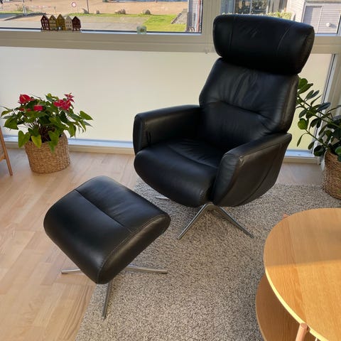 lænestol i sort okselæder er med indbygget fodstøtte, regulerbar ryg og udstigningshjælp. Stolen er udstyret med elfunktion med to motorer. Der er desuden monteret en betjeningspanel i højre side. Lænestolen løfter ca. 150 kg.