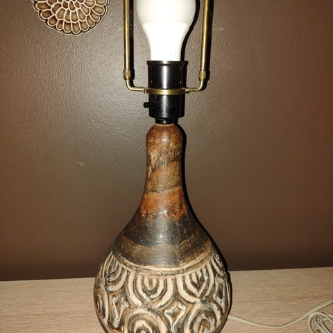 Keramiklampe i retrostil, designet af Birte Minor Vedel Howards – en utrolig populær kunstner fra Bryrup. Fuldstændig intakt og velholdt i beige og brunlige nuancer, kender ikke den nøjagtige årstal . men der findes ikke særlig mange keramiklamper fra Howards. Højde 25 op til fatning /40 cm op til pæren. Uden skærm