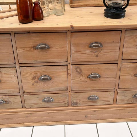 Købmandsdisk, fyrretræ, b: 178 d: 51 h: 76, Antik, Skænk, købmandsdisk med 24 skuffer