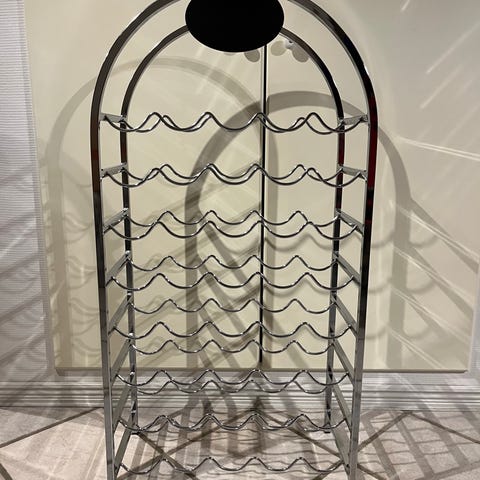 Stål vinreol i sektioner, hver sektion til 5 flasker vin. Mål står på sidste foto.