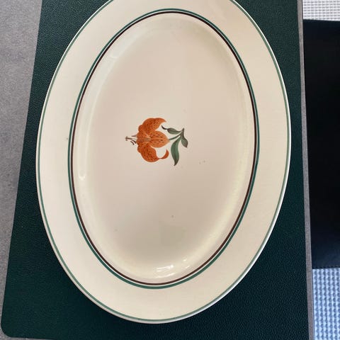 Stort ovalt fad 38 x 27 cm , h 4 cm. Ganske lidt misfarvning foto 8 - Bette skår under kant , ses ikke (se foto 6-7) derfor billig pris 75 kr.