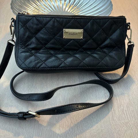 Taske. Crossbody, DKNY - Donna Karen New York, 22 x 14 x 4. Skind og tekstil. 3 rum, det i midten er med lynlås. Velholdt, men lidt slidt ved lukkemekanismen, se billede.