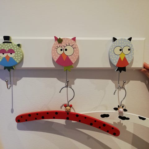 Ukendt Mærke Børnebogstøtter og Knagerække i blå træ. Sættet indeholder to bogstøtter og en knagerække, alle med Klodshans. Bogstøtterne er dekoreret med figurer, Klodshans på sin ged, og knagerækken har tre knager med samme tema. Velegnet til børneværelset