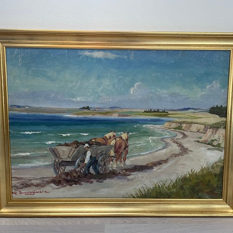 Oliemaleri, b: 43 h: 53, Alfred Brændgaard-Andersen. Havn bag klitter. Olie på lærred. Signeret A.B.A. 1964.
