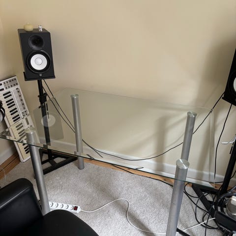 Anden arkitekt, bord, ROOM, Spisebord med glasplade og sorte ben. Glaspladen har lette ridser. Stolene på det ene billede følger ikke med.